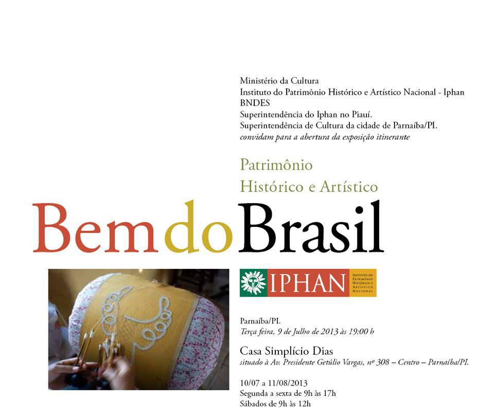 Bem do Brasil: Patrimônio Histórico e Artístico é a exposição itinerante do Instituto do Patrimônio Histórico e Artístico Nacional (Iphan), que poderá ser visitada em Parnaíba, Piauí, do dia 10 de julho até 11 de agosto, na Casa Simplicio Dias. A Mostra será aberta no dia 9 de julho, às 19h, para convidados.