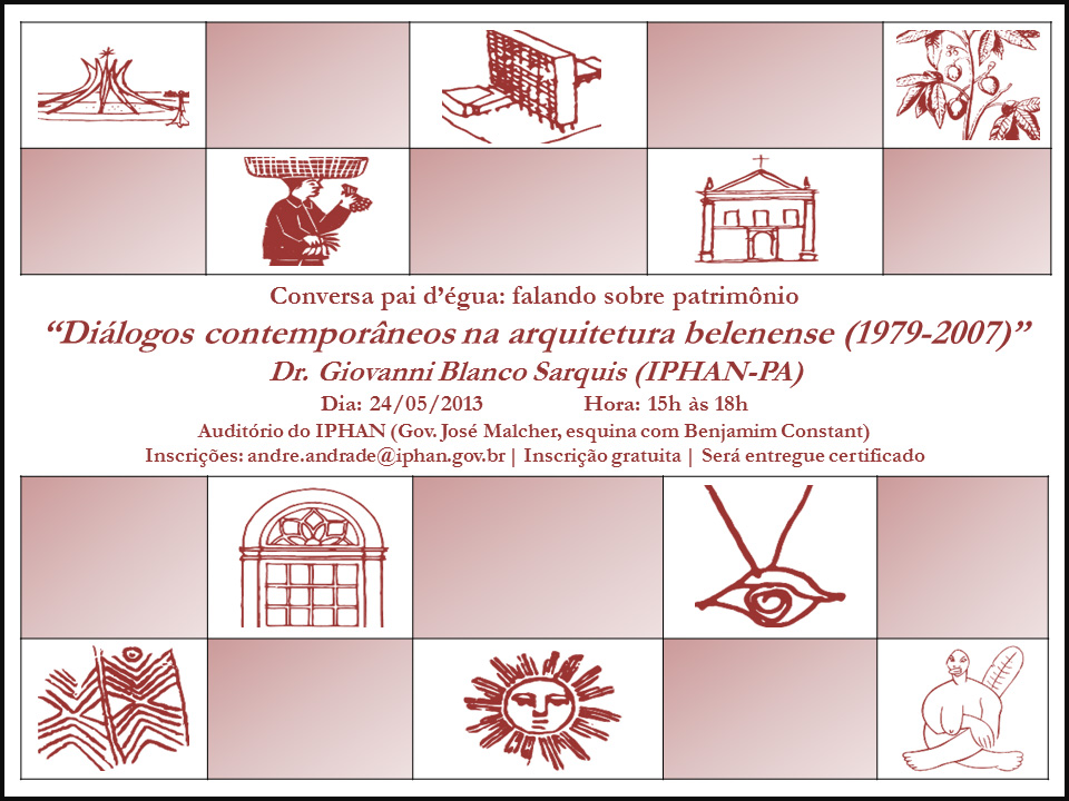 Os Diálogos contemporâneos na arquitetura belenense (1979-2007) será o tema da 8ª edição do Ciclo de Palestras 2013 “Conversa Pai D’égua: falando sobre patrimônio” promovido pelo Instituto do Patrimônio Histórico e Artístico Nacional no Pará (Iphan-PA).