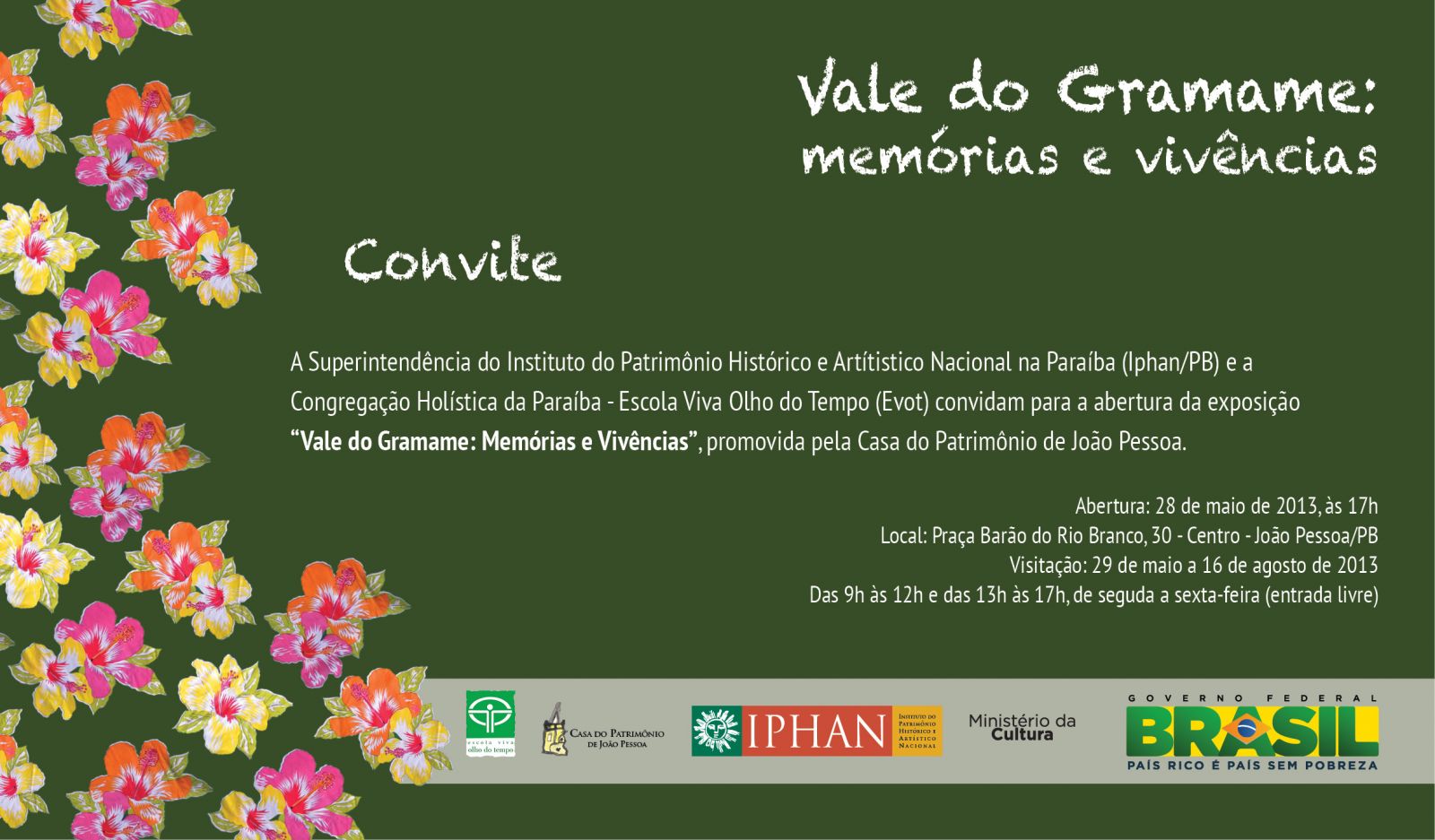 O Instituto do Patrimônio Histórico e Artístico Nacional na Paraíba (Iphan-PB) apresenta, de 28 de maio a 16 de agosto de 2013, a exposição Vale do Gramame: Memórias e Vivências. A região é rica em recursos naturais e preciosa pela vivacidade cultural. Abrange comunidades rurais, urbanas, quilombolas e indígena, com uma população aproximada de 20 mil habitantes, situada numa área periférica das cidades de João Pessoa e Conde.