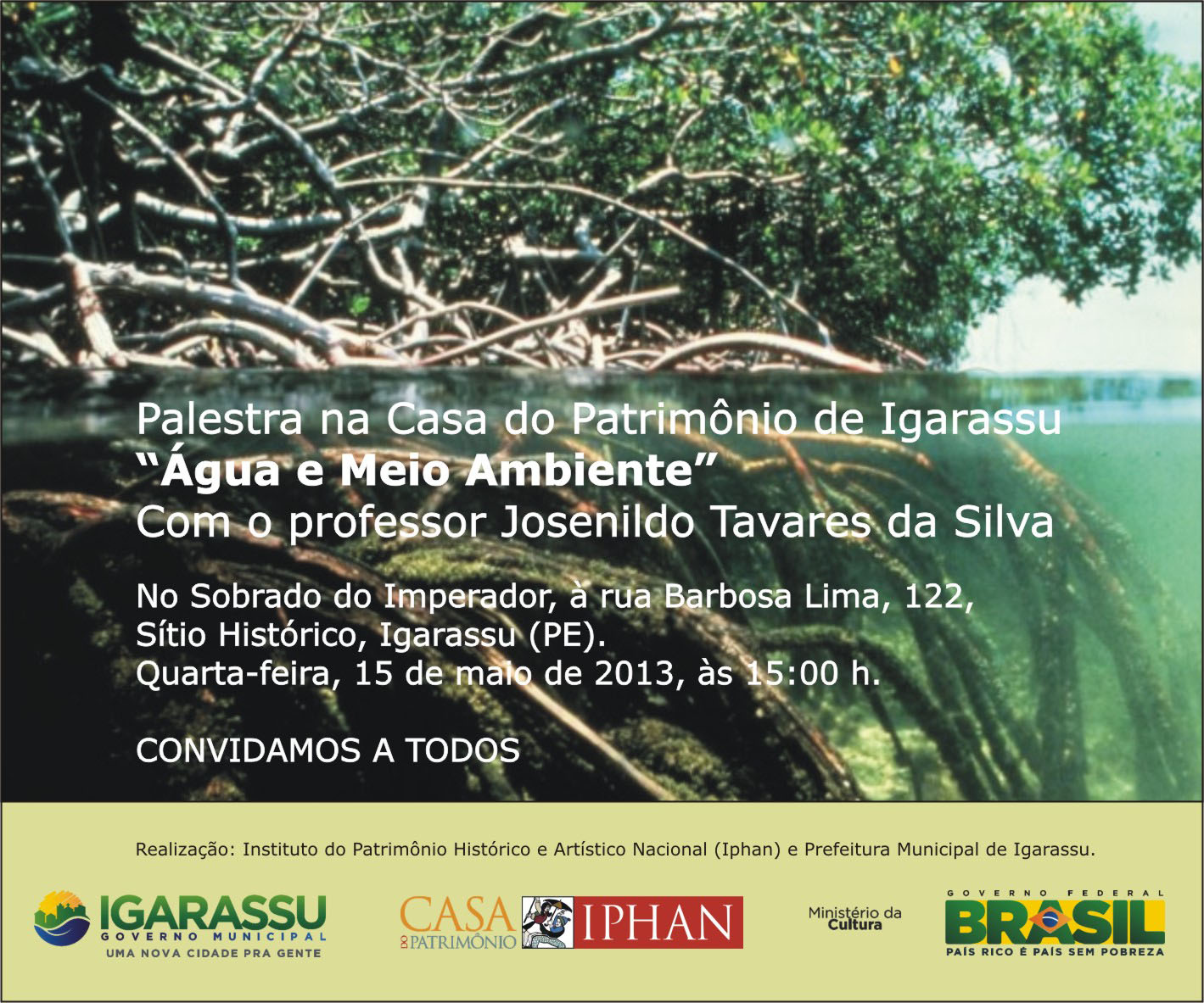 Todos esses elementos forma o Patrimônio Ambiental. Eles identificam um lugar e o jeito de ser e viver das pessoas que o habitam. Para falar sobre esse aspecto do Patrimônio Cultural o Instituto do Patrimônio Histórico e Artístico Nacional em Pernambuco (Iphan-PE), em parceria com a Prefeitura de Igarassu, promove a palestra Água e Meio Ambiente, na Casa do Patrimônio, no próximo dia 15 de maio, às 15h.