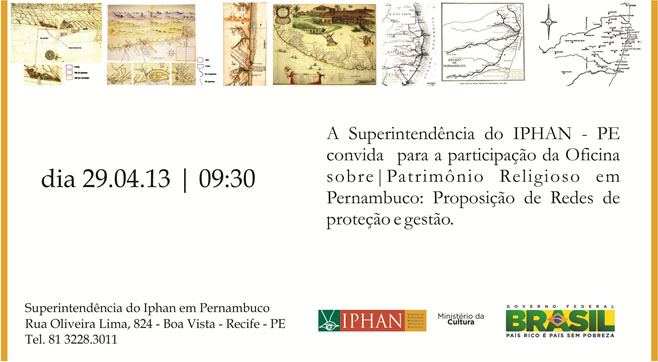Na próxima segunda-feira dia 29 de abril acontece no Instituto do Patrimônio Artístico e Histórico Nacional em Pernambuco (Iphan-PE) uma Oficina sobre o Patrimônio Religioso no estado. O evento é gratuito e aberto a todos os públicos. O objetivo é elaborar um documento propondo proteção e gestão do patrimônio religioso em Pernambuco, buscando a história oral e abordando contextos históricos e socioculturais do período de ocupação do território pernambucano, pela perspectiva da religião.