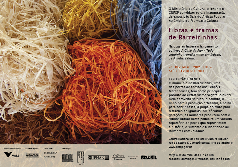Aproveitando todas as ofertas do município maranhense de Barreirinhas, como o palmito, o linho para produção artesanal, palha para cobrir casas e polpa do fruto para o fabrico de iguarias, o Centro Nacional de Folclore e Cultura Popular (CNFCP), do Instituto do Patrimônio Histórico e Artístico Nacional (Iphan), inaugura nesta quinta-feira, dia 20 de dezembro, a exposição Fibras e tramas de Barreirinhas. Durante a cerimônia, haverá ainda o lançamento do livro A Casa da Flor – Tudo caquinho transformado em beleza, de Amelia Zaluar.