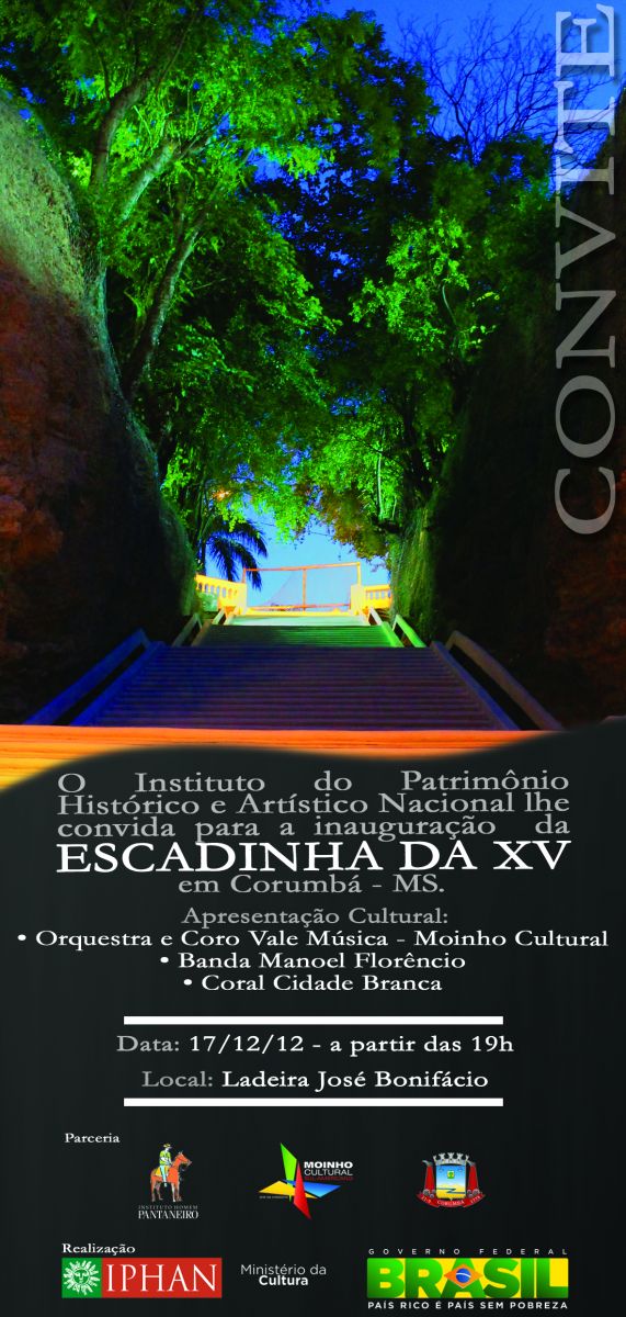 Na próxima segunda-feira, dia 17 de dezembro, o Instituto do Patrimônio Histórico e Artístico Nacional no Mato Grosso do Sul (Iphan-MS) entrega à comunidade de Corumbá a Escadinha da XV, que passou por obras de recuperação e contenção da encosta. A festa será a partir das 19h, com apresentação da Orquestra e Coro Vale Música (Moinho Cultural), Banda Manoel Florêncio e Coral Cidade Branca (Prefeitura Municipal de Corumbá).
