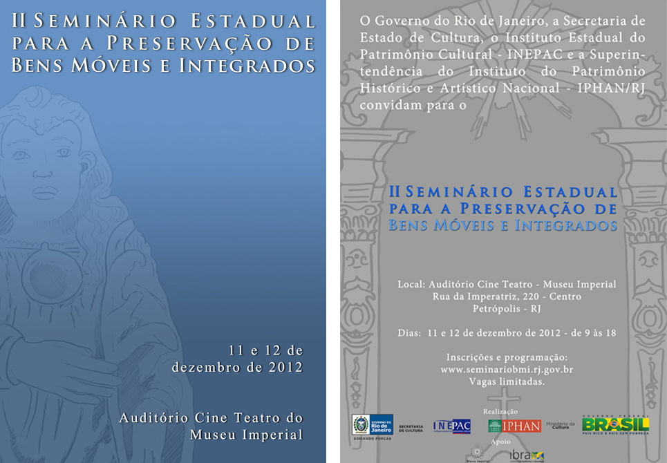 O Instituto do Patrimônio Histórico e Artístico Nacional (Iphan) e o Instituto Estadual do Patrimônio Cultural – INEPAC, órgão da Secretaria de Estado de Cultura do Rio de Janeiro (SEC), promovem nos dias 11 e 12 o II Seminário Estadual para a Preservação de Bens Móveis e Integrados. Será realizado em Petrópolis-RJ, no Auditório Cine Teatro do Museu Imperial – Rua da Imperatriz, 220 – Centro.