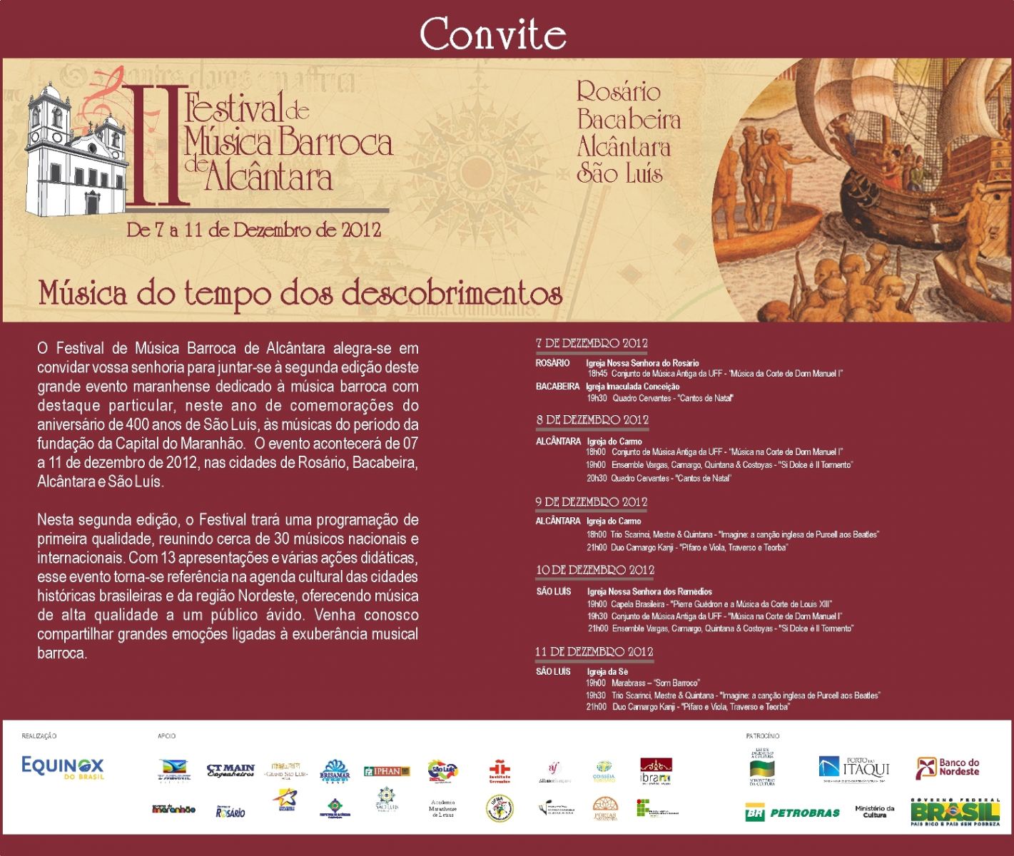 Para esta segunda edição, sete atrações musicais estão confirmadas, como o Conjunto de Música Antiga da Universidade Federal Fluminense (UFF), Marília Vargas e Ensemble, Quadro Cervantes, o Duo Camargo Kanji, formado por Guilherme Camargo e Ricardo Kanji, o trio formado por Paulo Mestre, Silvana Scarinci e Juan Manuel Quintana, além dos grupos maranhenses Capela Brasileira e Marabrass. O festival é uma oportunidade única do Maranhão receber grupos da música barroca para presentear a cidade São Luís pelo seu aniversário. São apresentações prometem encantar o público, com conteúdo ainda mais rico do que na edição inaugural.