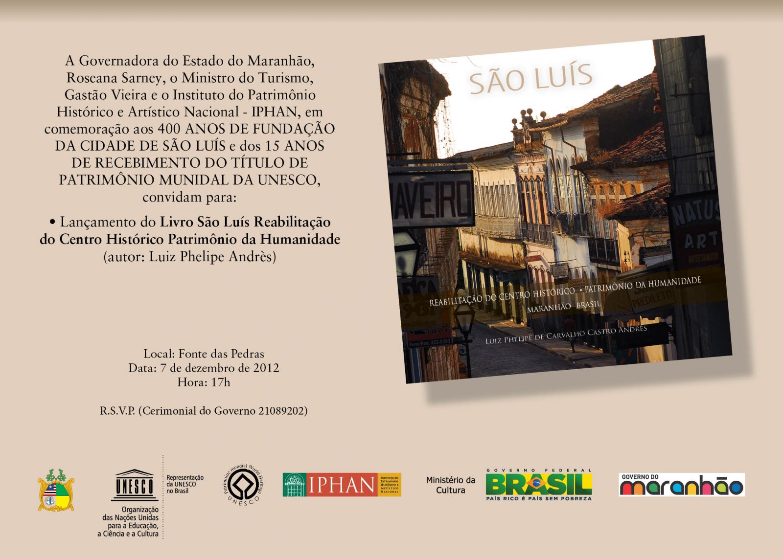 Celebrando o aniversário de 400 anos da fundação de São Luís e os 15 anos da declaração do Centro Histórico como Patrimônio Cultural da Humanidade, o Instituto do Patrimônio Histórico e Artístico Nacional no Maranhão (Iphan-MA) lança no dia 7 de dezembro, às 17h, na Fonte das Pedras, o livro São Luís, Reabilitação do Centro Histórico Patrimônio da Humanidade, de Luiz Phelipe de Carvalho Castro Andrés. A obra traz a descrição do Programa de Preservação Reabilitação do Centro Histórico de São Luís entre os anos de 1979 e 2006, que alcançou resultados expressivos para a obtenção do reconhecimento da Unesco em 1997.