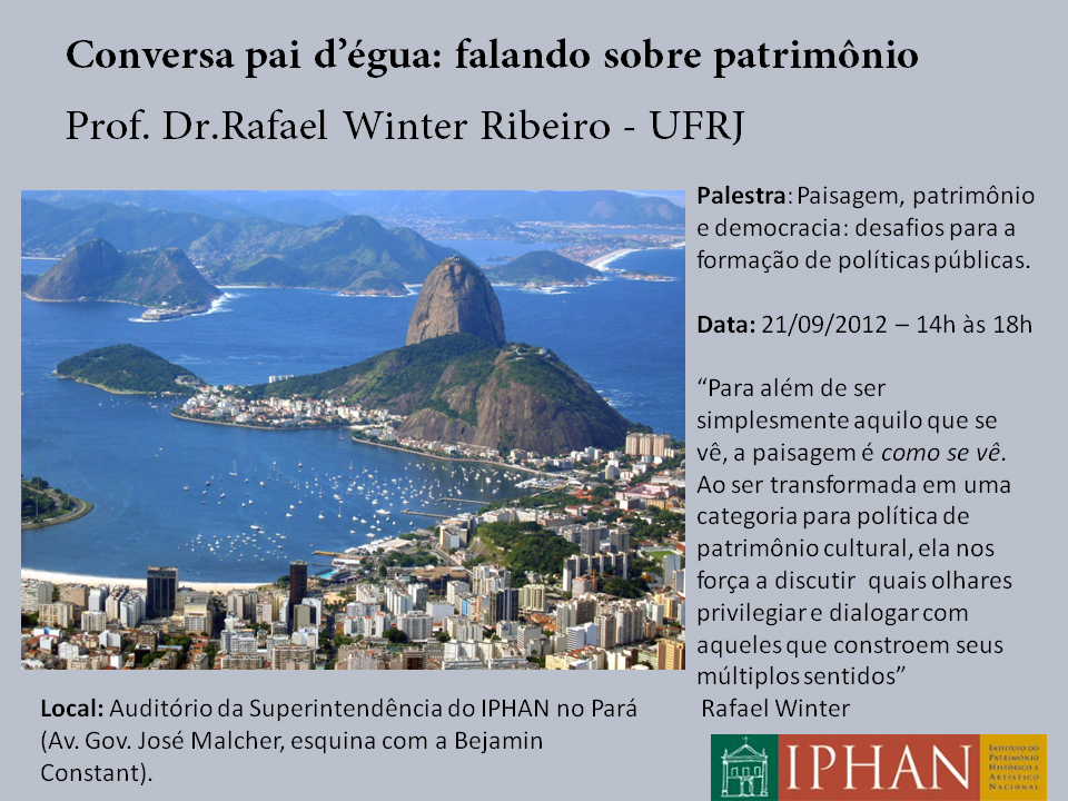 Trazendo diversas palestras que tratarão do patrimônio cultural, o Instituto do Patrimônio Histórico e Artístico Nacional no Pará (Iphan-PA) promove o ciclo de palestras Conversa pai d’égua: falando sobre patrimônio, a ser realizado no dia 21 de setembro do auditório do Iphan-PA. Temas como a paisagem cultural, aspectos legais da preservação do patrimônio e a educação patrimonial moldarão as conversas ao longo do dia.