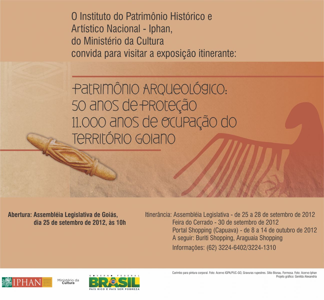 Essas são algumas questões que serão respondidas na exposição itinerante Patrimônio arqueológico: 50 anos de proteção, 11.000 anos de ocupação do território goiano, organizada pelo Instituto do Patrimônio Histórico e Artístico Nacional em Goiás (Iphan-GO), que começa no dia 25 de setembro na Assembleia Legislativa de Goiás. Fruto da comemoração dos 50 anos da Lei de Proteção do Patrimônio Arqueológico Brasileiro (Lei 3924/61), a exposição conta com painéis fotográficos autoexplicativos, módulos expositores e peças arqueológicas vindas de sítios pesquisados no estado de Goiás. Folders e catálogos com informações claras e didáticas também serão distribuídos. Os visitantes poderão compreender em que período histórico começou o processo de ocupação do estado de Goiás, conhecer os sítios arqueológicos mais antigos da região, entender o que é arqueologia e o que fazem os arqueólogos, além de saber como o Iphan trabalha na proteção desse patrimônio.