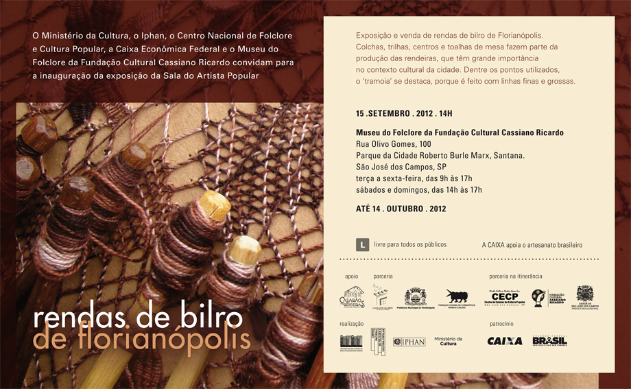 O Centro Nacional de Folclore e Cultura Popular (CNFCP) inaugura amanhã, 15 de setembro, sábado, às 14 horas, a exposição Rendas de bilro de Florianópolis da Sala do Artista Popular. A mostra fica no Museu do Folclore da Fundação Cultural Cassiano Ricardo, em São José dos Campos, SP até 27 de novembro.