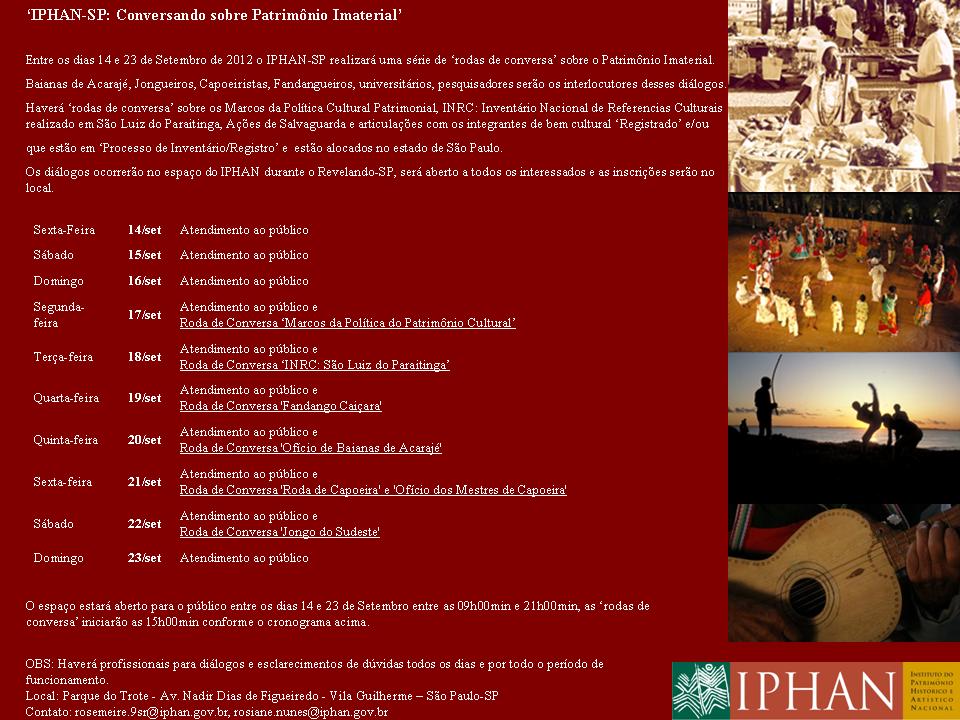A partir do dia 14 de setembro, o Instituto do Patrimônio Histórico e Artístico Nacional em São Paulo (Iphan-SP) iniciará o Conversando sobre o Patrimônio Imaterial, que traz uma série de rodas de conversa sobre o patrimônio cultural imaterial. Entre os destaques a serem discutidos estão as baianas de acarajé, capoeiristas, fandangueiros, jongueiros, pesquisadores e universitários. Além disso, os marcos da política cultural patrimonial, o Inventário Nacional de Referências Culturais (INRC) realizado em São Luiz do Paraitinga, tal como as ações de salvaguarda e articulações com integrantes de bem cultural registrado (ou em fase de registro) no estado de São Paulo também serão objetos de discussão.