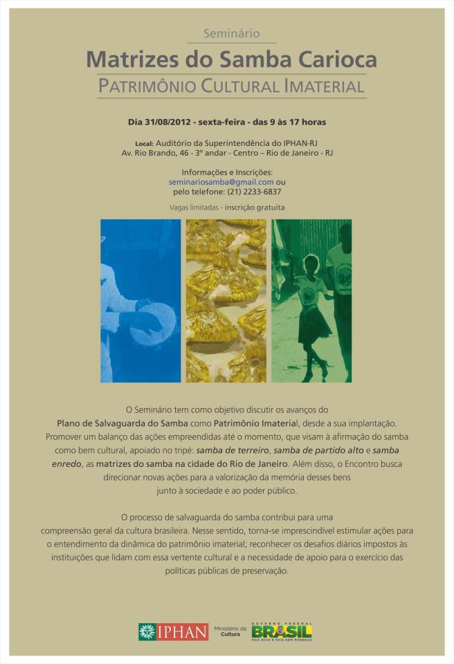 O Instituto do Patrimônio Histórico e Artístico Nacional no Rio de Janeiro (Iphan-RJ) promove, em parceria com o Centro Cultural Cartola, o Seminário Matrizes do Samba Carioca - Patrimônio Cultural Imaterial. A abertura será dia 31 de agosto (sexta-feira).