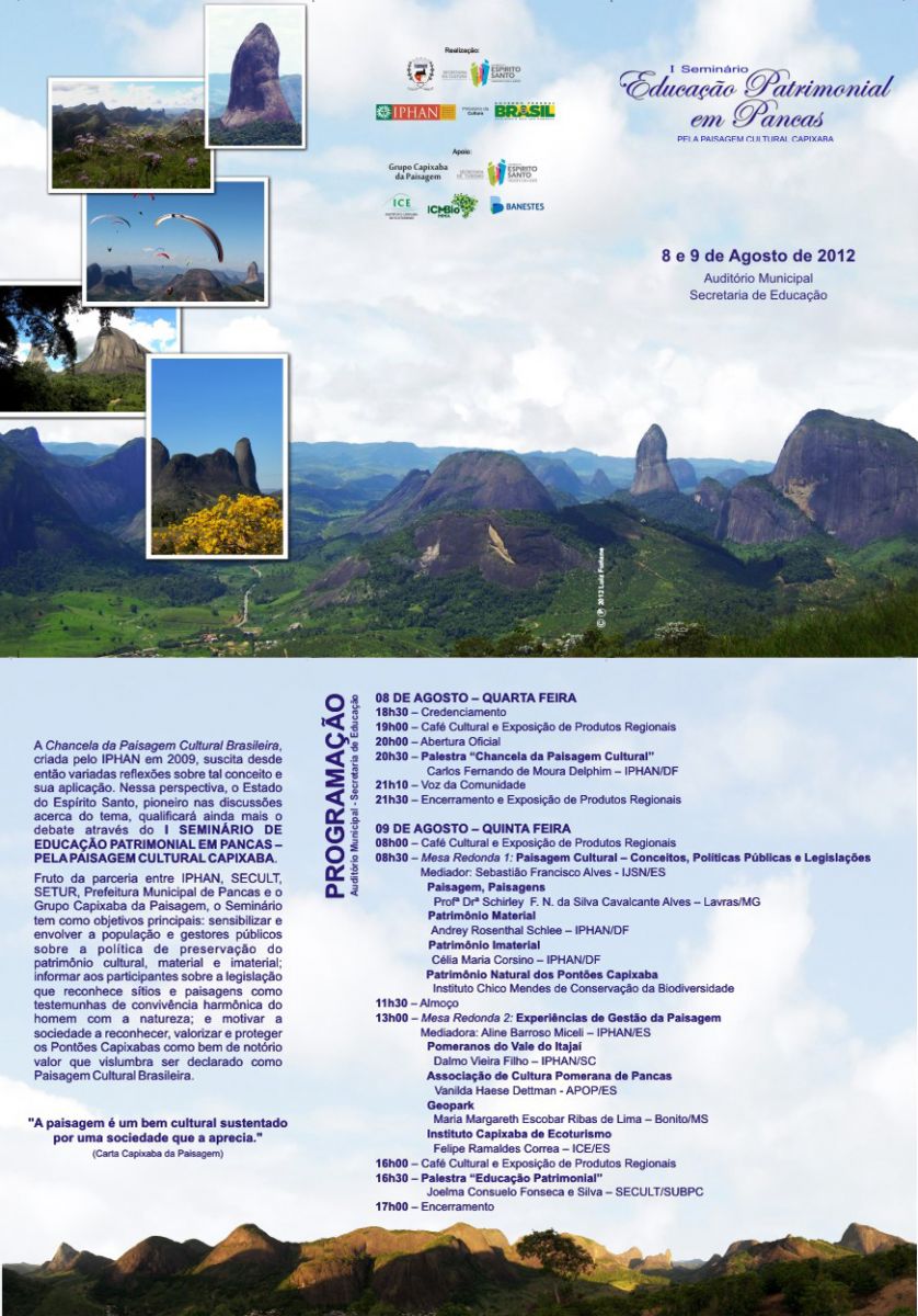 O Instituto do Patrimônio Histórico e Artístico Nacional (Iphan), as secretarias de Cultura (Secult) e de Turismo (Setur) do estado do Espírito Santo, e a Prefeitura de Pancas promoverão nos dias 8 e 9 de agosto o I Seminário de Educação Patrimonial em Pancas – Pela Paisagem Cultural Capixaba. O seminário tem como objetivo a sensibilizar e envolver a população e gestores públicos em função da política de preservação do patrimônio cultural, material e imaterial. Além disso, visa também esclarecer aos participantes sobre a legislação que reconhece sítios e paisagens como testemunhas de convivência harmônica entre homem natureza, motivando a sociedade por meio da valorização e reconhecimento dos Pontões Capixabas.