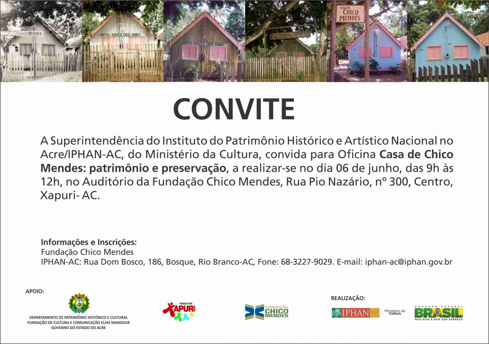 O Instituto do Patrimônio Histórico e Artístico Nacional no Acre (Iphan-AC) realiza na próxima quarta-feira, dia 6 de junho, a oficina Casa de Chico Mendes: patrimônio e preservação. O evento conta com o apoio do Departamento de Patrimônio Histórico e Cultural da Fundação de Cultura e Comunicação Elias Mansour – DPHC/FEM do Governo do Acre, da Prefeitura Municipal de Xapuri e da Fundação Chico Mendes. A oficina traz discussões sobre a preservação da casa, com ações desenvolvidas tanto pelo poder público quanto pela sociedade civil, além da declaração da edificação como bem cultural brasileiro e acreano.